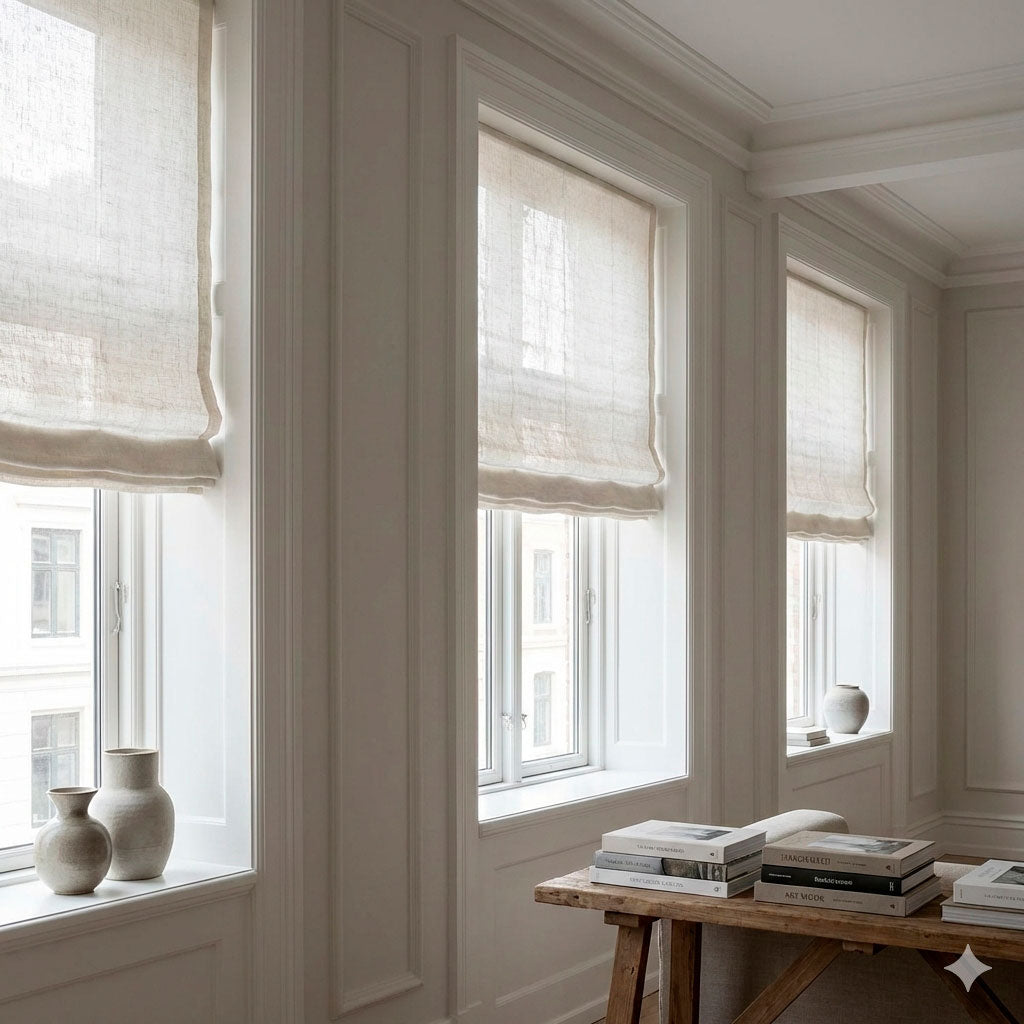 Et foldegardin i hvid hør er både en klassisk og smuk løsning til hjemmet og kontoret. Gardinet giver behagelig afskærmning uden at mørkelægge rummet fuldstændig, og når det er trukket op, indrammer og afslutter et foldegardin vinduets niche på smukkeste vis.